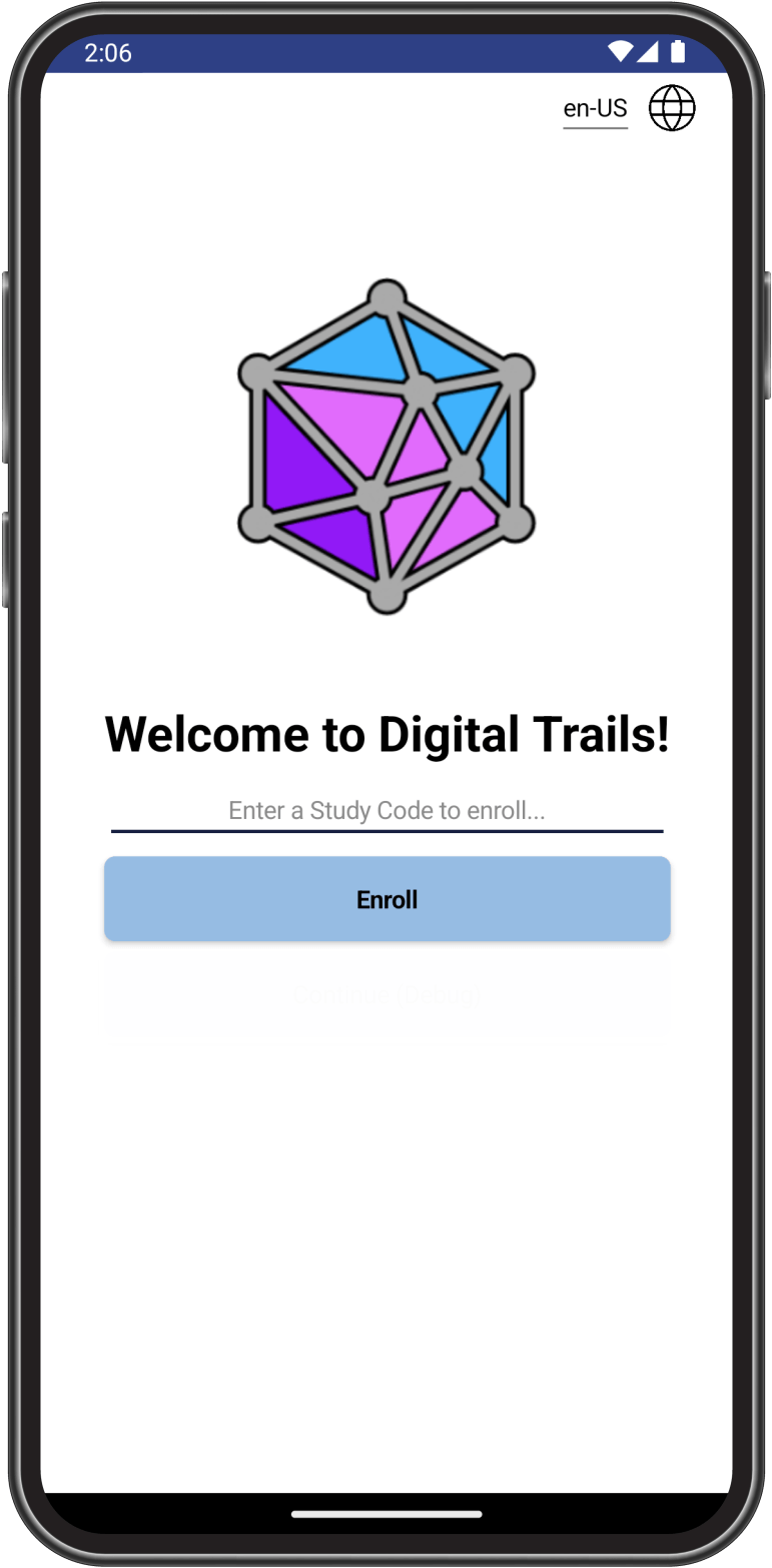 Digital Trails is a mobile app for sensing and intervention research on iOS and Android. Enrolling a participant is as easy as sharing your study code with them (study codes are created by the Digital Trails team). Once a participant enters their study code they are then invited to consent in the app. After participants consent they are returned to Digital Trails and you begin to collect data. That's it; you've just enrolled a new participant.